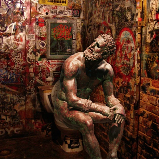 Hearing the song made me miss waiting in line for the bathroom. When the mind thrills to that—when nostalgia defaults to nostalgie de la boue—you know you’re in trouble. Specifically, I missed the shaggy camaraderie of a bathroom line that’s too long and too slow, stalled by a common enemy, the person or people in the bathroom. I missed the conjecture about what unnatural acts might cause one to remain for so long behind locked doors. I could even bring myself to miss the queasy foreboding that comes when, at last, it’s your turn to cross the threshold, and you must confront the evidence of your predecessors. As revolting as such scenes can be (especially should it fall to you to clean them up) each is the record of a crowd, a group inscription in filth. I remember a night at the Talking Head in Baltimore, circa 2007, when the venue was so packed and the restrooms in such disrepair that men and women alike were peeing in the sinks. Every lock was broken, every fixture clogged and spilling over onto the floor, which splashed with puddles of waste.